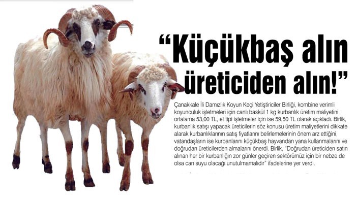 Çanakkale İli Damızlık Koyun Keçi Yetiştiriciler Birliği, yaklaşan Kurban Bayramı öncesi yaptığı açıklamada; Çanakkale için güncel üretim giderleri dikkate alındığında kombine verimli koyunculuk işletmeleri için canlı baskül 1 kg kurbanlık üretim maliyeti ortalama 53,00 TL, et tipi işletmeler için ise 59,50 TL olduğunu bildirdi. Birlik, kurbanlık satışı yapacak üreticilerin söz konusu üretim maliyetlerini dikkate alarak kurbanlıklarının satış fiyatlarını belirlemelerinin önem arz ettiğini, vatandaşların ise kurbanlarını küçükbaş hayvandan yana kullanmalarını ve doğrudan üreticilerden almalarını önerdi.