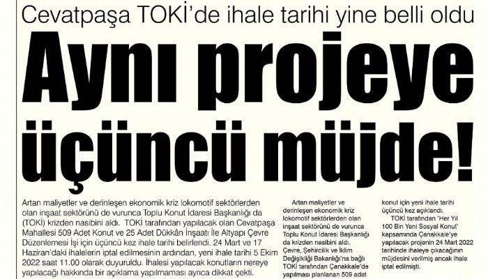 TOKİ tarafından 'Her Yıl 100 Bin Yeni Sosyal Konut' kapsamında Çanakkale'ye yapılacak projenin 24 Mart 2022 tarihinde ihaleye çıkacağının müjdesini verilmiş ancak ihale iptal edilmişti. Bir sonraki ihale tarihinin 17 Haziran olduğu ifade edilmiş oradan da bir ses çıkmamıştı.