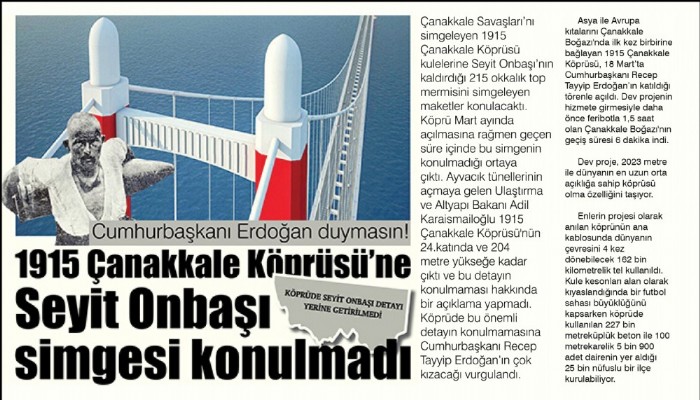 Ayvacık tünellerinin açılışına katılmak üzere önceki gün Ulaştırma ve Altyapı Bakanı Adil Karaismailoğlu Çanakkale’ye geldi. Bakan Karaismailoğlu, 1915 Çanakkale Köprüsü'nün 24.katında ve 204 metre yükseğe kadar çıktı ve burada basın mensuplarına açıklamalar yaptı. Bakanın çıktığı küllenin en tepesinde Seyit Onbaşı’nın kaldırdığı top mermisinin maketi olması gerekirken, şimdiye kadar yerine yerleştirilmediği görüldü. Seyit Onbaşı’ya büyük önem veren Cumhurbaşkanı Recep Tayyip Erdoğan’ın bu detayın yerine getirilmemesine çok kızacağı belirtiliyor.