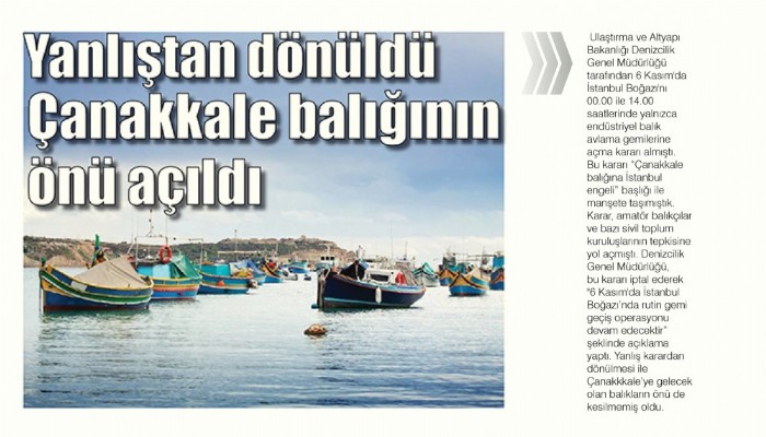Bu kararı “Çanakkale balığına İstanbul engeli” başlığı ile manşete taşımıştık. Karar, amatör balıkçılar ve bazı sivil toplum kuruluşlarının tepkisine yol açmıştı. Denizcilik Genel Müdürlüğü, bu kararı iptal ederek "6 Kasım'da İstanbul Boğazı’nda rutin gemi geçiş operasyonu devam edecektir” şeklinde açıklama yaptı. Yanlış karardan dönülmesi ile Çanakkkale’ye gelecek olan balıkların önü de kesilmemiş oldu.
