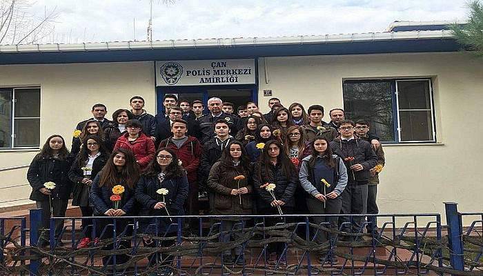 İlçe Emniyet Müdürü Hüseyin Uğurelli’yi makamında ziyaret ederek bir buket çiçek veren Fen lisesi Müdürü Murat Karagöz ve öğrenciler, daha sonra ilçede görev yapan polis memurlarına karanfil dağıttı.