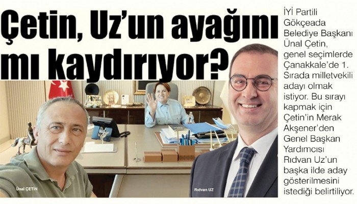 Son seçimde kıl payı milletvekilliğini kaçıran Rıdvan Uz, bu seçimde de aday gösterileceklerin başında geliyor. Uz’un Çanakkale’de aday gösterilip gösterilmeyeceği bilinmiyor. Eğer Çanakkale’de gösterilecekse genel başkan yardımcısı olduğu için 1. sıradan gösterilecek. Bu durum da milletvekili adayı olmak isteyen Başkan Çetin’in planlarını altüst ediyor. Çünkü İYİ Parti’nin Çanakkale’de 2 milletvekili çıkartması imkansız gibi. Bu yüzden Çetin’in Çanakkale’de 1. sırada aday gösterilmesi için Uz’un başka yerde aday gösterilmesi gerekiyor.