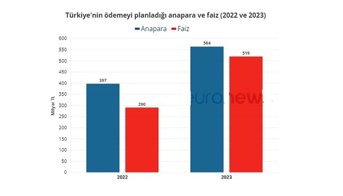 Hazine ve Maliye Bakanlığı’nın duyurduğu resmi tahmin ve programa göre ise 2022 ve 2023 yıllarında 810 milyar TL faiz ödenecek.Bakanlığın açıkladığı programa göre Türkiye 2023 yılında neredeyse anapara kadar faiz ödeyecek. Anapara için 564 milyar lira, faiz için ise 519 milyar lira ödeme planlanıyor. Buna göre ödenecek 100 liranın 52 lirası anaparaya, 48 lirası ise faize gidecek. Programlarda sapma olduğundan ödeme miktarlarının daha da artması bekleniyor.Türkiye Eylül 2021’den bu yana “düşük faiz”li yeni bir ekonomik model takip ediyor. Merkez Bankası (TCMB) politika faizinde son 13 ayda 7 kez indirime gitti. Böylece politika faizi 19’dan yüzde 10,5’e kadar geriledi.