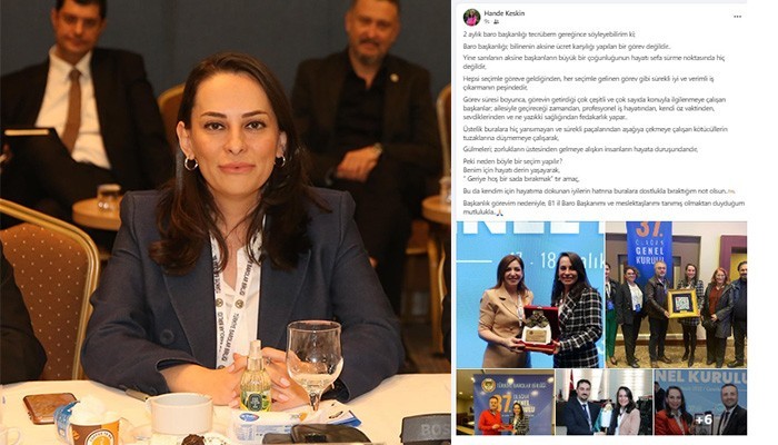 Çanakkale Baro Başkanı Hande Keskin'in paylaşımında şunlar yer aldı; ‘’2 aylık baro başkanlığı tecrübem gereğince söyleyebilirim ki; Baro başkanlığı; bilinenin aksine ücret karşılığı yapılan bir görev değildir.Yine sanılanın aksine başkanların büyük bir çoğunluğunun hayatı sefa sürme noktasında hiç değildir,Hepsi seçimle göreve geldiğinden, her seçimle gelinen görev gibi sürekli iyi ve verimli iş çıkarmanın peşindedir,Görev süresi boyunca, görevin getirdiği çok çeşitli ve çok sayıda konuyla ilgilenmeye çalışan başkanlar; ailesiyle geçireceği zamandan, profesyonel iş hayatından, kendi öz vaktinden, sevdiklerinden ve ne yazıkki sağlığından fedakarlık yapar..Üstelik buralara hiç yansımayan ve sürekli paçalarından aşağıya çekmeye çalışan kötücüllerin tuzaklarına düşmemeye çalışarak,Gülmeleri; zorlukların üstesinden gelmeye alışkın insanların hayata duruşundandır,Peki neden böyle bir seçim yapılır?Benim için hayatı derin yaşayarak,“ Geriye hoş bir sada bırakmak” tır amaç,Bu da kendim için hayatıma dokunan iyilerin hatrına buralara dostlukla bıraktığım not olsun.. Başkanlık görevim nedeniyle, 81 il Baro Başkanımı ve meslektaşlarımı tanımış olmaktan duyduğum mutlulukla.’’dedi.