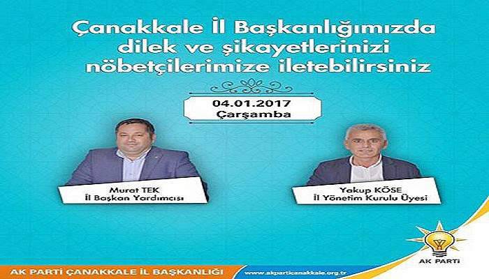 AK Parti Çanakkale İl Başkanlığı tarafından belli günlerde dilek ve şikayetler için nöbetçiler konuluyor. Çarşamba günkü nöbetçiler ise İl Başkan Yardımcısı Murat Tek ve İl Yönetim Kurulu Üyesi Yakup Köse oldu. AK Parti Çanakkale İl Başkanlığı'nın resmi sosyal medya sayfasında yapılan nöbetçi duyurusunun altına vatandaşlar da istekte bulundu. İstekte bulunanlardan biri de partinin kuruluşundan beri üyesi Mesut Atay oldu. Köyüne cenaze aracı isteyen Atay isteğini şöyle iletti, "Murat başkanım anladım ben köyüme birtane cenaze taşıma aracı istiyorum. AKP kurulduğundan beri üyeyim ve 160 ve 180 oy çıkartıyorum. Ama hiç birşey yaptıramıyorum. Bunu anlayamıyorum. Sizlerden bir yardım istiyorum. Bolayır üyesi olarak. Bana bir zaman veya bir tarih verin o zaman. Bolayır'da oy patlaması olur. Sizlerden hayırlı haberler bekliyorum Murat Başkanım. Allah yardımcınız olsun. Bolayır AKP üyesi Mesut. "