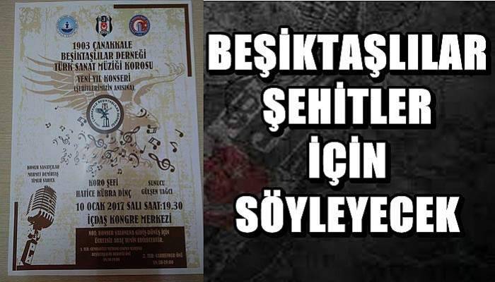 1903 Çanakkale Beşiktaşlılar Derneği Türk Sanat Müziği Korosu 10 Ocak Salı günü İÇDAŞ Kongre Merkezi'nde konser düzenleyecek.Hatice Kübra Dinç'in şefliğinde düzenlenecek olan koro, şarkılarını şehitler için söyleyecek.Gecenin konuk sanatçıları ise Mehmet Demirtaş ve Timur Sarıca olacak.