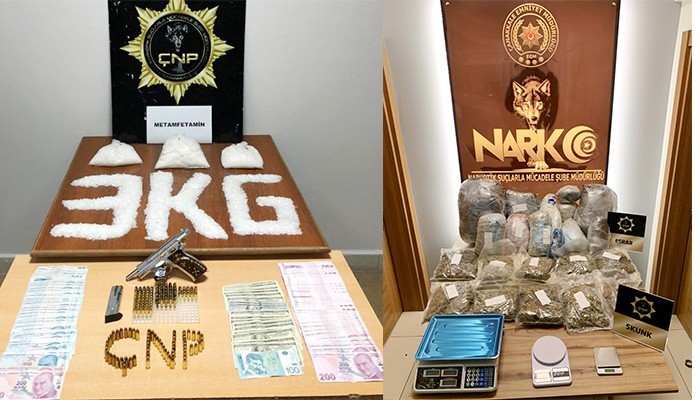 Yapılan yakalamalar neticesinde şüphelilerden 22 kilo 500 gr. Esrar, 7 kilo 365 gr. Skunk, 6 kilo 833 gr. Metamfetamin, 2 kilo 760 gr. Bonzai, 137 gr. Kokain, 32 gr. Eroin, 7.738 adet Sentetik Ecza, 963 adet Captagon ile 114 adet Ecstasy hap, 301 kök Kenevir Bitkisi, 41 adet Tabanca, 15 adet Tüfek ve 632 adet Mermi ile 78 adet Fişek, 110.782 TL, 2.600 Dolar ve 125 Euro Para ele geçirildi ve tüm maddelere el konuldu.