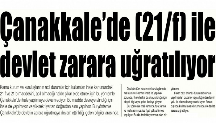 Bu maddenin acil olmayan durumlar için de Çanakkale’de kullanılarak bazı iş insanlarına haksız kazanç sağlandığı belirtiliyor. Bunun gibi birçok iddia Çanakkale’de konuşulmaya devam ediyor. Çanakkale’de çoğu zaman konu itibariyle 21 f ve 21 b maddelerinde belirtilen durumlar ortada olmamasına rağmen ve pazarlık usulüne tabi olmayan kamu alımlarının, eksik rekabet ortamı içerisinde kapalı kapılar arkasında bu usulle yapıldığı ve kamu kaynaklarının usulsüz bir şekilde bazı kişilere aktarıldığı ifade ediliyor.