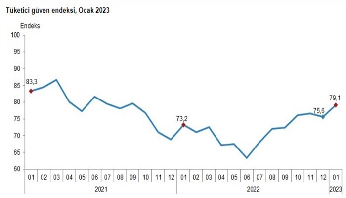 Türkiye İstatistik Kurumu ve Türkiye Cumhuriyet Merkez Bankası işbirliği ile yürütülen tüketici eğilim anketi sonuçlarından hesaplanan Tüketici Güven Endeksi, Ocak ayında bir önceki aya göre yüzde 4,6 oranında arttı; Aralık ayında 75,6 olan endeks, Ocak ayında 79,1 oldu.Tüketici Güveni böylece Eylül 2021'den beri en yüksek seviyeye çıktı.Tüketici güven endeksinin 100'den büyük olması tüketici güveninde iyimser durumu, 100'den küçük olması tüketici güveninde kötümser durumu gösteriyor.Gelecek 12 aylık dönemde hanenin maddi durum beklentisi 75,4'ten 79,9'a, 12 aylık genel ekonomik durum beklentisi 77,3'ten 82,7'ye çıktı.