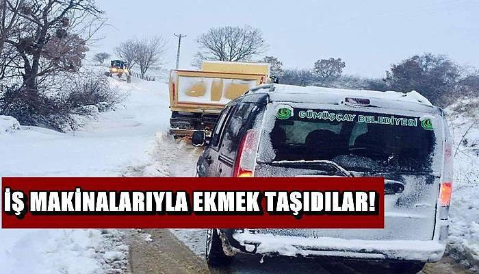 Gümüşçay Belediyesi, beldeye yakın 7 köye iş makineleri ile ekmek ulaştırdı. Ambaroba, Kanibey, Çeşmealtı, Akant, Emirorman, Eğridere ve Şakirbey köylerinin yollarını açma çalışması da yapan belediye ekipleri, fırıncıların ulaşamadığı köylere ekmek taşıdı. Gümüşçay Belediye Başkanı Adnan Pastırmacı, “kar yağışının etkisini göstermeye başladığı andan itibaren hem belde içinde hem de ilçe merkezi ve köy yollarını açık tutmak için üstün çaba sarf ediyoruz. Köy yollarının yanı sıra Biga ilçe merkezi yönünde Şakirbey Kavşağı’na kadar yol açma çalışmalarımız devam ediyor. Toplam 6 iş makinesi ve 20 personelimiz ile karla mücadele ediyoruz” dedi.