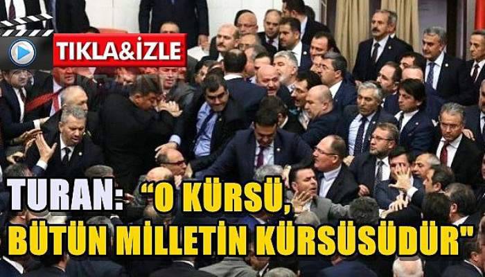 Meclis kürsüsünün savaş meydanlarında kazanıldığına dikkat çeken Turan, “O kürsü, bütün milletin kürsüsüdür. Bütün siyasi partilerin kürsüsüdür. Savaş meydanlarında istiklal mücadelesi verilerek kazanılmış, 15 Temmuz'da gazi olmuş bir kürsüdür. Meclis kürsüsünü işgal etmeye çalışan zorbaların gürültüsüne pabuç bırakacak değiliz. Herkes haddini ve yerini bilsin” dedi.