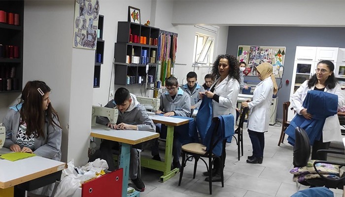 Bursa Mustafakemalpaşa İbni Sina Özel Eğitim Meslek Okulu; çorap, atkı ile mama kâsesi üretimi yapıyor. Okul öğretmenleri ve yöneticilerinin sosyal sorumluluk kapsamında başlattıkları yardım kampanyasından elde edilen gelirle aldıkları konteyner da malzemelerle birlikte Kahramanmaraş iline gönderildi.