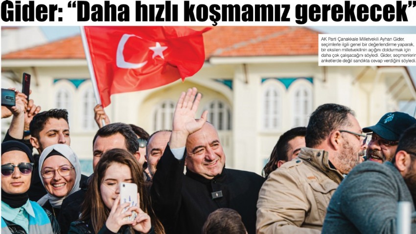 Seçim sonrası Çanakkale için yapılacak çalışmalar hakkında bilgiler veren Ayhan Gider “Çanakkale’de yapılması gereken birçok konu var ama bence birinci öncelik deprem konusu. Belediyelerimizle birlikte merkeze de belediyemize rağmen bu deprem işini çözmek zorundayız. Çünkü yeni bir deprem yaşadık. Bakın bu tarifi imkansız bir şey. Bu birilerinin iki kat fazla almasıyla zenginin bir dairesinin daha olmasıyla izah edilecek bir konu değil. Derhal deprem işini çözmek zorundayız. Çanakkale yatırımlarında da önceliğimiz balık olacak. İkincisi Lapseki Otobanı'nın tamamlanması. Çünkü köprü yapıldıktan sonra trafik yükümüz çok arttı. Hem şehri rahatlatmak adına hem İstanbul'a ulaşımımız artık çok güzel. İzmir ulaşımımızı da bu hatta almak zorundayız. Çanakkale'yi daha güzel günlere taşımak zorundayız. Çan Yenice hattının bu yolla birlikte ciddi bir montaj sanayine döneceğini, lojistik üssü olacağına inanıyorum. Bir an önce buna başlamamız lazım. İzmir’e artık tüneller var. Ezine OSB’si çok hızlı artık fabrikalar bir bir yapılmaya başlanarak bu konuyla ilgili atılması gereken adımlar atıldı. Kendi rayında gider inşallah. Çanakkale'yle ilgili yatırım konusunu seçimlerden sonra bir daha geniş bir şekilde yapacağız. Ticaret sanayi odamızla, borsamızla, esnaf odamızla, ÇASİAD'ımızla ve tüm paydaşlarıyla birlikte tartışıp, o yatırımları birlikte yönlendirmemiz lazım. Ortak payda fikirle ortak Çanakkale. Bundan daha güzel bir payda olabilir mi? Dünyanın hiçbir yerinde bundan daha güzel bir ortak fayda yok” dedi.