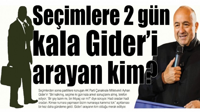 Seçimlerden sonra partililere konuşan AK Parti Çanakkale Milletvekili Ayhan Gider’in “Biri kalkmış, seçime iki gün kala anket sonuçlarını almış, telefon ediyor; ‘Bir şey lazım mı, bir ihtiyaç var mı?’ diye soruyor. Hadi oradan hadi oradan. Kimse numara yapmasın bizim numaraya karnımız tok” açıklaması bir kez daha gündeme geldi. Gider’i arayanın kim olduğu merak ediliyor.