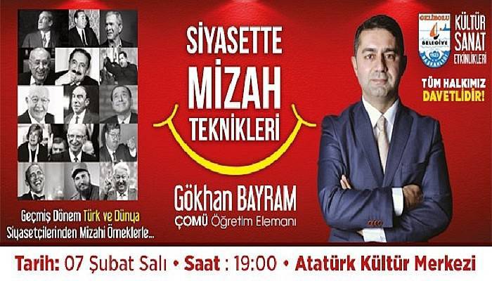Çanakkale Onsekiz Mart Üniversitesi (ÇOMÜ) öğretim elemanı ve hitabet eğitmeni Gökhan Bayram, Gelibolu Belediyesi’nin kültür ve sanat etkinlikleri çerçevesinde “Siyasette Mizah Teknikleri” konulu sunum gerçekleştirecek.