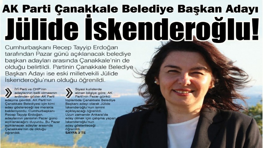 Siyasi kulislerde alınan bilgiye göre; AK Parti’nin Pazar günkü toplantıda Çanakkale Belediye Başkanı adayı olarak Jülide İskenderoğlu’nun ismini açıklayacağı öğrenildi. Uzun zamandır Ankara’da aday olmak için çalışma yapan İskenderoğlu’nun aday gösterileceği öğrenildi.