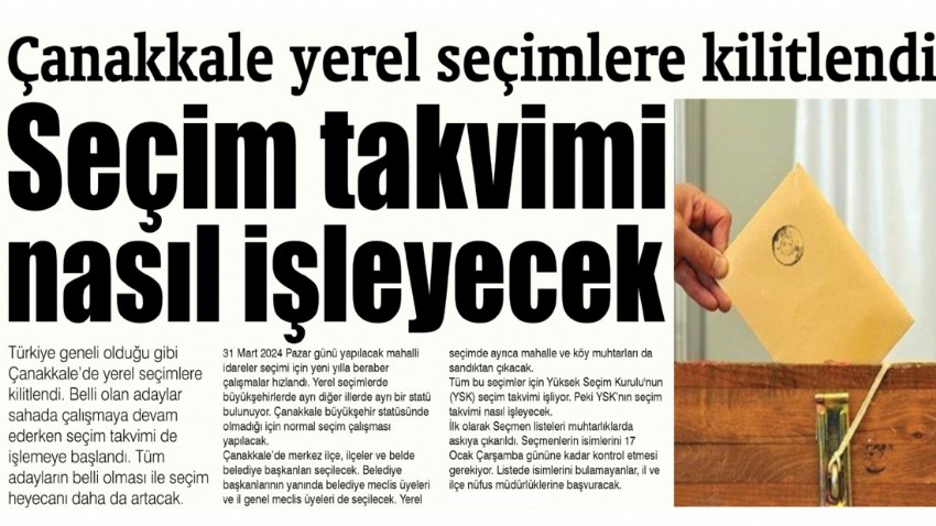 31 Mart 2024 Pazar günü yapılacak mahalli idareler seçimi için yeni yılla beraber çalışmalar hızlandı. Yerel seçimlerde büyükşehirlerde ayrı diğer illerde ayrı bir statü bulunuyor. Çanakkale büyükşehir statüsünde olmadığı için normal seçim çalışması yapılacak.