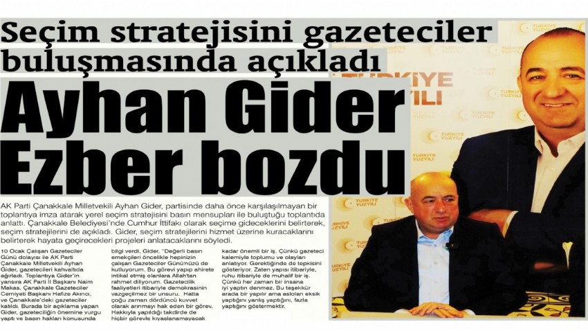 10 Ocak Çalışan Gazeteciler Günü dolayısı ile AK Parti Çanakkale Milletvekili Ayhan Gider, gazetecileri kahvaltıda ağırladı. Toplantıya Gider’in yansıra AK Parti İl Başkanı Naim Makas, Çanakkale Gazeteciler Cemiyeti Başkanı Hafize Akıncı, ve Çanakkale’deki gazeteciler katıldı. Burada bir açıklama yapan Gider, gazeteciliğin önemine vurgu yaptı ve basın hakları konusunda bilgi verdi, Gider, “Değerli basın emekçileri öncelikle hepinizin çalışan Gazeteciler Günü'nüzü de kutluyorum. Bu görevi yapıp ahirete intikal etmiş olanlara Allah'tan rahmet diliyorum. Gazetecilik faaliyetleri itibariyle demokrasinin vazgeçilmez bir unsuru. Hatta çoğu zaman dördüncü kuvvet olarak arınmayı hak eden bir görev. Hakkıyla yapıldığı takdirde de hiçbir görevle kıyaslanamayacak kadar önemli bir iş. Çünkü gazeteci kalemiyle toplumu ve olayları anlatıyor. Gerektiğinde de tepkisini gösteriyor. Zaten yapısı itibariyle, ruhu itibariyle de muhalif bir iş. Çünkü her zaman bir insana iyi yaptın denmez. Bu teşekkür arada bir yapılır ama aslolan eksik yaptığını yanlış yaptığını, fazla yaptığını göstermektir. Bu da bir cesaret işidir. Cesareti ruh Ötesinde ben varım diyebilen adamların seçtiği meslektir, gazetecilik. Ben toplum için bir şeyler söylemek istiyorum diyen insanların işidir. Yoksa şu salonda olanların birçoğunu çok uzun süredir tanıyorum. Herhalde rekor Saadettin'de otuz yılı bulmuştur. Candan beri beraberiz. Ama birçok arkadaşımla da yirmi yıldır tanışıyoruz ve biliyorum ki burada sarf ettikleri emeği, performansı herhangi bir sektörde sarf etselerdi çok daha fazla kazanç elde ederlerdi. Onun için gazetecilik sıradan evini geçindirmek için eee hayatını idame etmek için yapılan bir iş olmadığını ben çok yakinen biliyorum. Ve bu anlamda da hepinizi tebrik ediyorum.