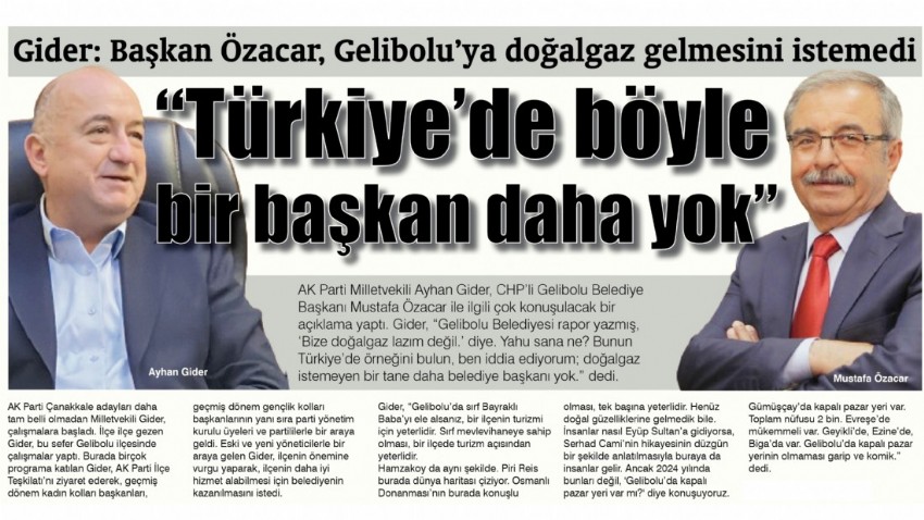AK Parti Milletvekili Ayhan Gider, CHP’li Gelibolu Belediye Başkanı Mustafa Özacar ile ilgili çok konuşulacak bir açıklama yaptı. Gider, “Gelibolu Belediyesi rapor yazmış, ‘Bize doğalgaz lazım değil.’ diye. Yahu sana ne? Bunun Türkiye’de örneğini bulun, ben iddia ediyorum; doğalgaz istemeyen bir tane daha belediye başkanı yok.” dedi.
