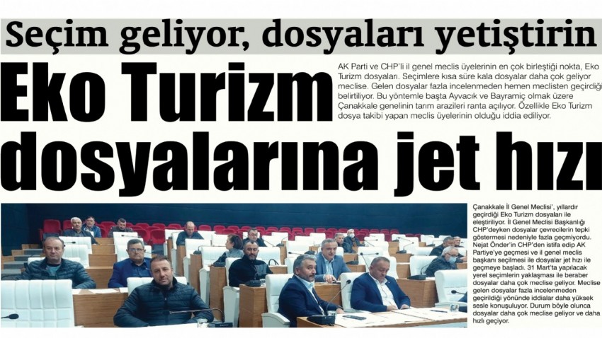 AK Parti ve CHP’li il genel meclis üyelerinin en çok birleştiği nokta, Eko Turizm dosyaları. Seçimlere kısa süre kala dosyalar daha çok geliyor meclise. Gelen dosyalar fazla incelenmeden hemen meclisten geçirdiği belirtiliyor. Bu yöntemle başta Ayvacık ve Bayramiç olmak üzere Çanakkale genelinin tarım arazileri ranta açılıyor.  Özellikle Eko Turizm dosya takibi yapan meclis üyelerinin olduğu iddia ediliyor.