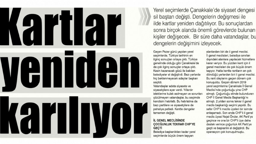 Geçen Pazar yapılan seçimde CHP yine çoğunluğu aldı. CHP 19, AK Parti 12, İYİ Parti 2 ve MHP 1 il genel meclis üyesi çıkardı. Bir önceki yerel seçimlerde CHP Çanakkale merkezde 4, AK Parti 2 il genel meclisi çıkarmıştı. Bu seçimde ise CHP yine 4, AK Parti 1, İYİ Parti de 1 il genel meclisi çıkardı. Bu sonuçlara göre İl Genel Meclisi’nin CHP’ye tekrar geçmesi bekleniyor. CHP, yine başkanlıkta anlaşamazsa bir önceki dönem gibi operasyonlar devreye girebilir.