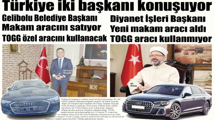 Türkiye iki başkanın makam araç tercihini konuşuyor. Biri AK Partili Gelibolu Belediye Başkanı seçilen Ali Kamil Soyuak, diğeri ise Diyanet İşleri Başkanı Ali Erbaş. Başkan Soyuak, Audi A6 aracını satacak onun yerine makam aracı olarak kendisine ait TOGG Marka aracı kullanacak. Başkan Erbaş ise eski aracının ihtiyacını karşılamadığı, TOGG marka aracını da kullanmadığı için 15 milyon TL civarında bir değere sahip Audi A8 aracı kiralaması tartışma konusu oldu. Emekli maaşının 10 bin olduğu, tasarruf tedbirlerinin alındığı bu dönemde iki başkanın makam aracı tercihleri Türkiye gündemine oturdu.