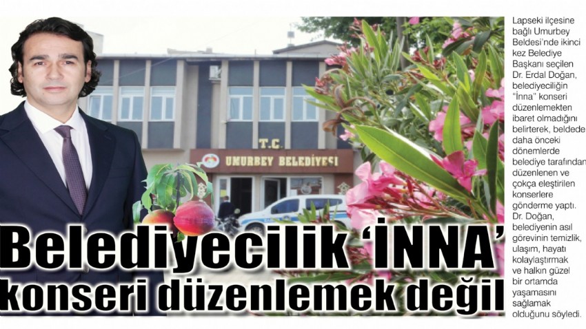 Lapseki ilçesine bağlı Umurbey Beldesi’nde ikinci kez Belediye Başkanı seçilen Dr. Erdal Doğan, belediyeciliğin “İnna” konseri düzenlemekten ibaret olmadığını belirterek, beldede daha önceki dönemlerde belediye tarafından düzenlenen ve çokça eleştirilen konserlere gönderme yaptı. Dr. Doğan, belediyenin asıl görevinin temizlik, ulaşım, hayatı kolaylaştırmak ve halkın güzel bir ortamda yaşamasını sağlamak olduğunu söyledi.