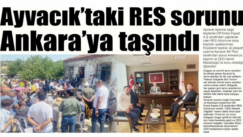 Ayvacık ilçesine bağlı köylerde OR Enerji İnşaat A.Ş tarafından yapılacak olan RES tribününe karşı köylüler ayaklanmıştı. Köylülerin tepkisi ve şikayeti üzerine Ayvacık AK Parti tarafından sorun Ankara’ya taşındı ve ÇED Genel Müdürlüğü’ne konu iletildiği öğrenildi.