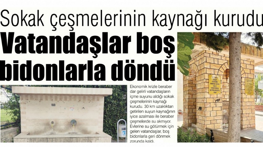 Ekonomik krizle beraber dar gelirli vatandaşların içme suyunu aldığı sokak çeşmelerinin kaynağı kurudu. 30 km uzaklıktan getirilen suyun kaynağının iyice azalması ile beraber çeşmelerde su akmıyor. Evlerine su götürmek için gelen vatandaşlar, boş bidonlarla geri dönmek zorunda kaldı.