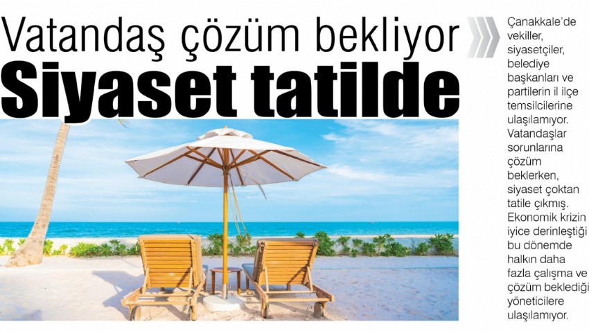 Çanakkale’de vekiller, siyasetçiler, belediye başkanları ve partilerin il ilçe temsilcilerine ulaşılamıyor. Vatandaşlar sorunlarına çözüm beklerken, siyaset çoktan tatile çıkmış. Ekonomik krizin iyice derinleştiği bu dönemde halkın daha fazla çalışma ve çözüm beklediği yöneticilere ulaşılamıyor.