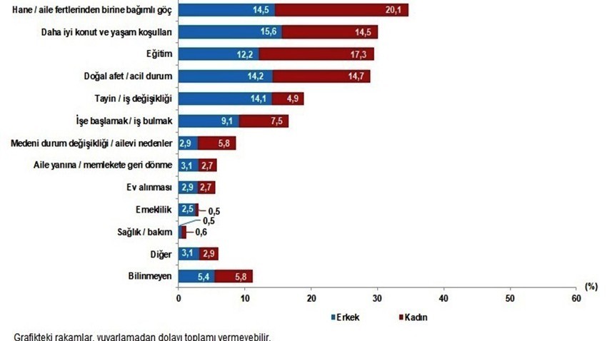 Türkiye'de 2023 yılında cinsiyete göre en önemli göç etme nedeni; erkeklerde 257 bin 277 kişi ile daha iyi konut ve yaşam koşulları olurken kadınlarda 361 bin 15 kişi ile hanedeki fertlerden birine bağımlı göç oldu. Erkeklerde, hanedeki fertlerden birine bağımlı göç ve doğal afet / acil durum, kadınlarda ise eğitim ve doğal afet / acil durum diğer önemli göç nedenleri arasında yer aldı.
