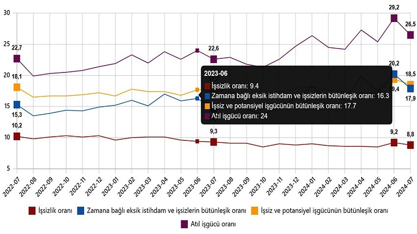 Zamana bağlı eksik istihdam, potansiyel işgücü ve işsizlerden oluşan atıl işgücü oranı 2024 yılı Temmuz ayında bir önceki aya göre 2,7 puan azalarak %26,5 oldu. Zamana bağlı eksik istihdam ve işsizlerin bütünleşik oranı %17,9 iken işsiz ve potansiyel işgücünün bütünleşik oranı %18,5 olarak tahmin edildi.