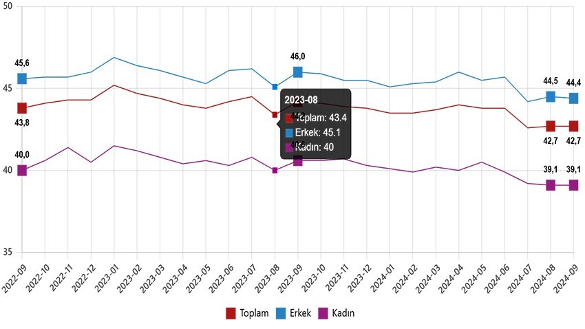 İstihdam edilenlerden referans döneminde işbaşında olanların, mevsim ve takvim etkilerinden arındırılmış haftalık ortalama fiili çalışma süresi 2024 yılı Eylül ayında bir önceki aya göre aynı seviyede kalarak 42,7 saat olarak gerçekleşti.