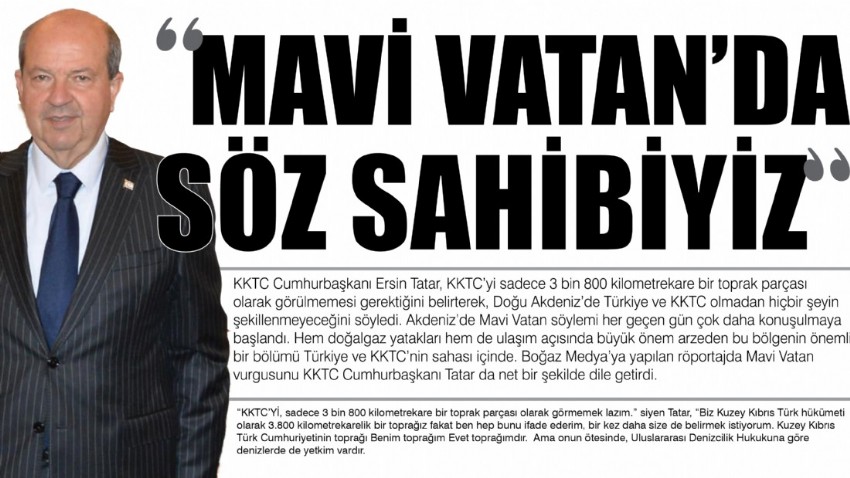 Akdeniz’de Mavi Vatan söylemi her geçen gün çok daha konuşulmaya başlandı. Hem doğalgaz yatakları hem de ulaşım açısında büyük önem arzeden bu bölgenin önemli bir bölümü Türkiye ve KKTC’nin sahası içinde. Boğaz Medya’ya yapılan röportajda Mavi Vatan vurgusunu KKTC Cumhurbaşkanı Tatar da net bir şekilde dile getirdi.