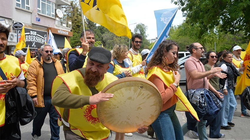 “Dostlar, çalışma yaşamında da örgütlenmenin önündeki engeller her geçen gün daha da büyüyor. Türkiye'deki emekçilerin karşı karşıya olduğu zorluklar ve sendikal hak ihlallerine askeri darbe dönemlerini aşan grev yasakları, gözaltı ve tutuklamalar ekleniyor. Buradan bir kez daha Eğitim Sen yöneticilerine ve Birtek Sen Genel Başkanına verilen hukuksuz ve keyfi cezaları şiddetle kınıyoruz. Yolsuzlukları, talan ve rant düzenleri devam etsin istiyorlar. Bunun için siyasetçiler, gazeteciler, aydınlar, sendikacılar, avukatlar, sanatçılar, muhalif tüm kesimler hedef alınıyor. Yargı, iktidarın, Saray’ın emir eri haline getiriliyor. 1 Mayıs, 1886’da Chicago’da yakılan kıvılcımın bugüne taşınan kararlılığıdır. Bu tarihsel çağrı, yoksulluğa, güvencesizliğe, sömürüye ve adaletsizliğe karşı emeğin örgütlü gücüdür!”