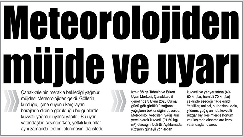 Çanakkale’nin merakla beklediği yağmur müjdesi Meteorolojiden geldi. Göllerin kurduğu, içme suyunu karşılayan barajların dibinin görüldüğü bu günlerde kuvvetli yağmur uyarısı yapıldı. Bu uyarı vatandaşları sevindirirken, yetkili kurumlar aynı zamanda tedbirli olunmasını da istedi.