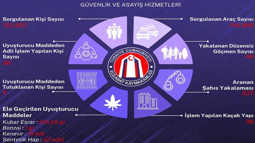 Paylaşılan verilere göre, yıl boyunca 153 bin 922 kişi ve 144 bin 960 araç sorgulandı. Yapılan denetim ve operasyonlarda aranan 337 şahıs yakalanırken, 69 düzensiz göçmen tespit edildi. Kaçak yapılarla mücadele kapsamında ise 36 yapı hakkında işlem yapıldı.