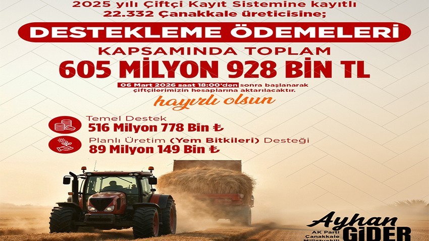 Gider’in verdiği bilgilere göre Çanakkale genelinde 22 bin 332 üreticiye toplam 605 milyon 928 bin lira destek sağlanacak. Destek kapsamında üreticilere 516 milyon 778 bin lira temel destek ödemesi ve 89 milyon 149 bin lira yem bitkileri desteği verilecek.