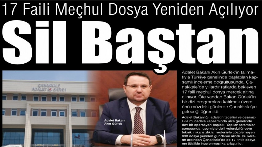 Adalet Bakanı Akın Gürlek’in talimatıyla Türkiye genelinde başlatılan kapsamlı inceleme doğrultusunda, Çanakkale’de yıllardır raflarda bekleyen 17 faili meçhul dosya mercek altına alınıyor. Öte yandan Bakan Gürlek’in bir dizi programlara katılmak üzere önümüzdeki günlerde Çanakkale’ye geleceği öğrenildi.