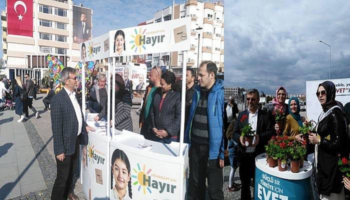 Ak Parti Merkez İlçe Teşkilatı referandum için yaptıkları köy ziyaretlerinin ardından Evet standında vatandaşlara çiçek dağıttı. Üyeler daha sonra Hayır standını da ziyaret etti.