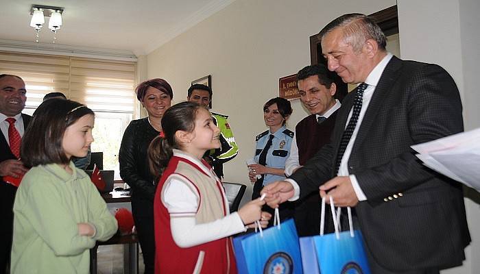 Türk Polis Teşkilatının kuruluşunun 172. yıldönümü ve Polis Haftası’nı kutlamak için Okul Müdürü Ferda Ayan ve okul öğretmenleri ile birlikte ziyaret gerçekleştiren öğrencileri, İl Emniyet Müdürü Celal Sel ağırladı. Ziyaret öncesi, Haber Merkezi’nde yer alan Mobese kameralarına kaydedilen görüntüleri izleyen öğrencilere, polisler tarafından trafik kuralları hakkında detaylı bilgiler verildi. Bilgilendirmenin ardından öğrenciler, İl Emniyet Müdürü Celal Sel ile bir araya geldi. Ziyarette öğrenciler, polislere yönelik yazdıkları mektupları okudu ve yaptıkları resimleri İl Emniyet Müdürü Celal Sel ve polislere takdim ederek Türk Polis Teşkilatının kuruluşunun 172. yıldönümünü ve 10 Nisan Polis Haftası’nı kutladılar.